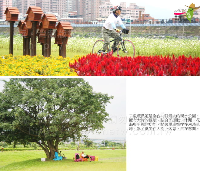 二重疏洪道全長7.7公里,是全台北縣最大的親水公園,除了具備疏洪防汛的功能之外,也是連結三重、新莊、五股、蘆洲等地的交通樞紐。二重疏洪道實施綠化整治與休閒設施工程已有一段時間,其中最主要的計畫之一是將二重疏洪道規劃成花海公園,大片的花海點綴親水綠地,並且利用自行車道串聯起自然生態、花海景觀與運動設施,二重疏洪道在2010年5月已被正式命名為「幸福水漾公園」。