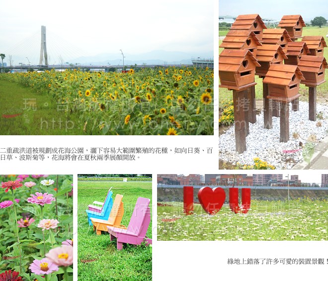 這裡主要灑播的花種為百日草、向日葵與波斯菊,花開的季節約在5~8月與11~2月間,二重疏洪道從花海公園的第一期工程開始,將會陸續規劃生活體驗區、運動休閒及入口生態區、都會親水區、自然體驗區,等到完工之後這裡將成為大台北市民生態賞鳥、休閒運動、賞游花海的絕佳去處。