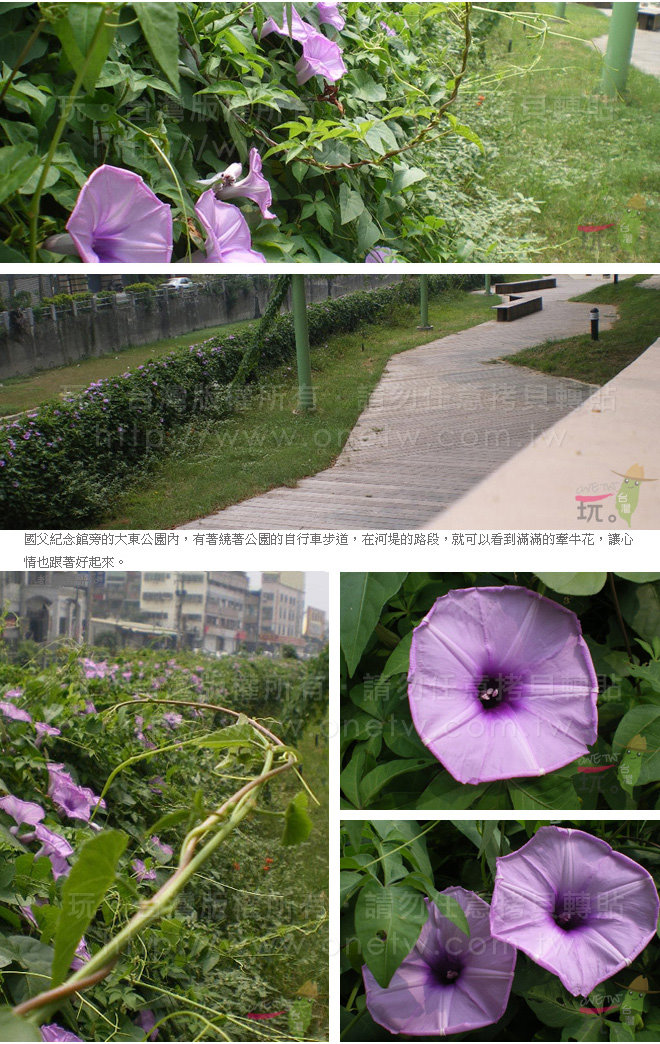 大東公園內的自然景觀豐富,除了有生態池、瀑布外,沿著河堤旁的自行車步道,可以看到滿滿的牽牛花海展放姿色,讓鐵馬騎士們,能在夏秋的花季時,一睹牽牛花的美麗身影,除此之外,秋天時最美的樹花,台灣欒樹,也正在綻放她的美,週休二日時,來一趟國父紀念館賞牽牛花,參加一下藝文展覽,都會是一個很好的選擇。