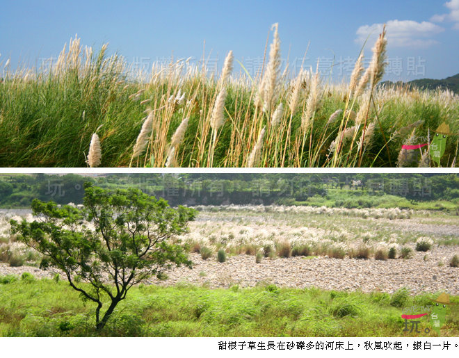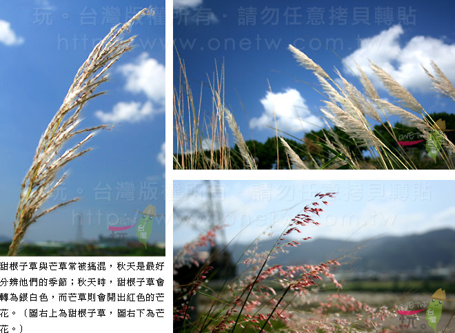 甜根子草常被誤認為芒草,最簡單的分別方式是從生長地來判斷,甜根子草生長在河床與溪畔邊的砂礫地上;芒草則分布在低海拔的山坡惡地上,花期比田根子草晚一點,約11月開始,會開紅色的芒花。大漢溪河床雜草叢生,想賞花的遊客也要注意自身安全,盡可能從遠觀不要太過接近河床喔!