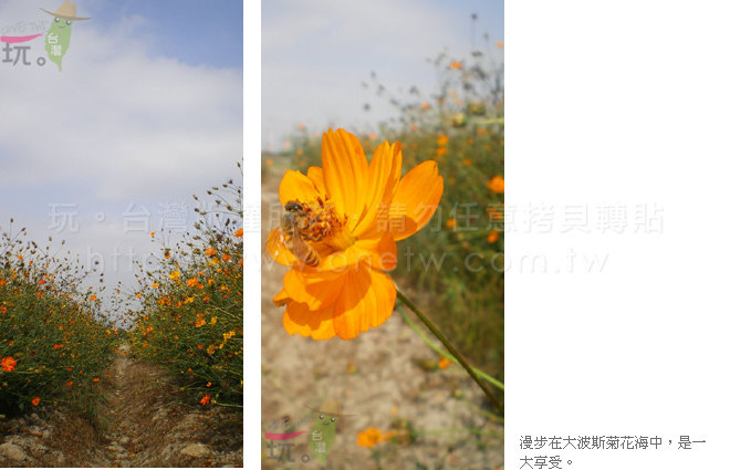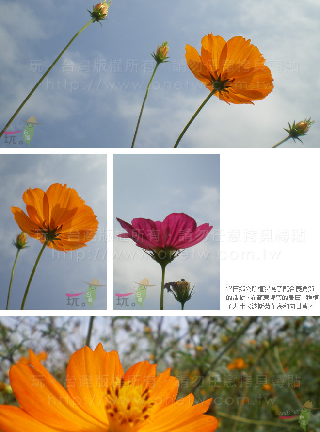 台南市官田區配合當地菱角節的活動,會在葫蘆埤生態公園的旁邊南62鄉道,種植了大波斯菊及向日葵花田。