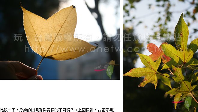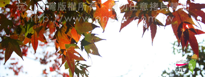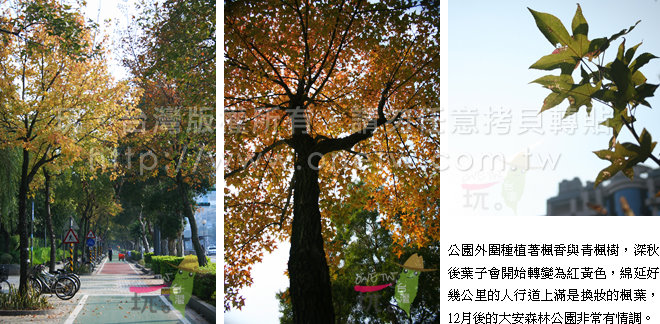尤其是到了深秋,公園外圍綿延數公里的人行道上種植了夾道的楓香與楓樹,每到花賞季到來,樹枝上的楓葉變成耀眼的黃色與紅色,相當有情調。楓葉變紅的條件是溫差變化大的氣候,因此深秋的氣候很適合楓葉變色,如果遇到冷峰過境時,更利楓葉摧紅。