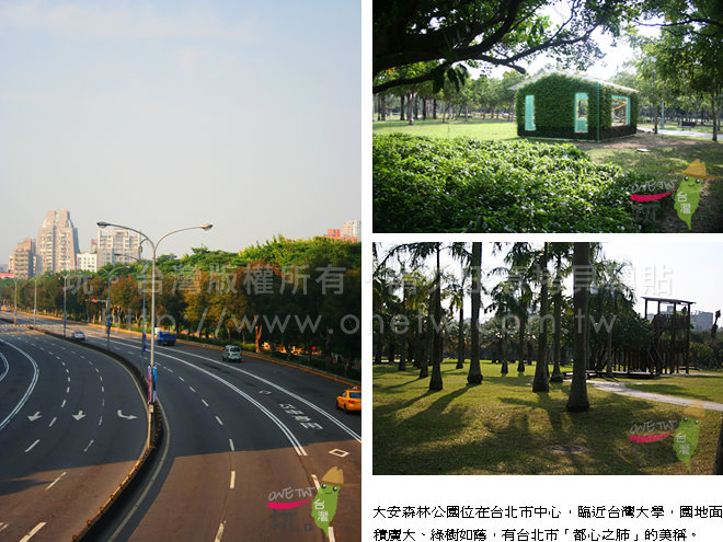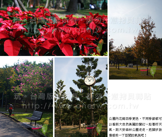 全台北市最大的公園,大安森林公園面積達到20餘公頃,是水泥城市中難得的綠地,又被大家稱為台北市的「都心之肺」。大安森林公園活動場地與遊樂設施規劃良善,豐富的自然生態資源,也是賞花客很喜歡的地方。