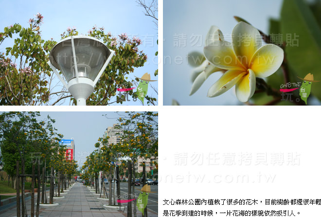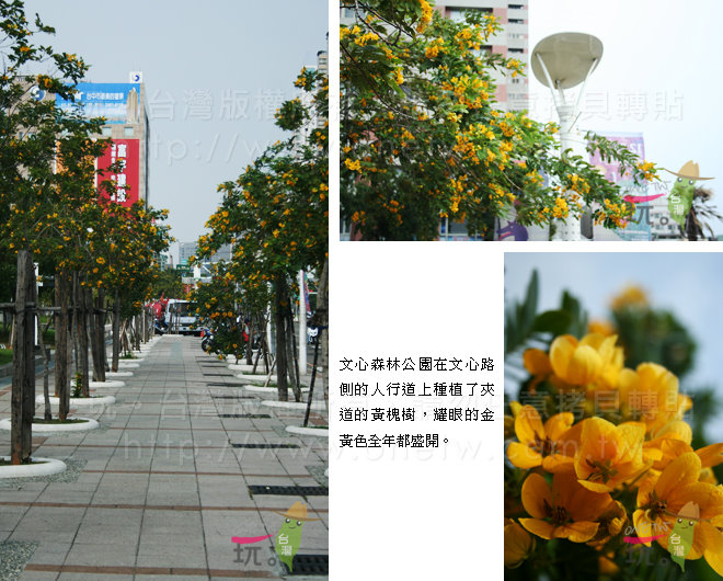 一年四季都是文心公園賞花的好月份,從文心路的方向往文心森林公園看去,一整排的黃槐樹全年開花,黃澄澄的花海相當耀眼。牽手散步的情侶、親子檔、遛狗的遊客,在台中市總是藍天白雲的好天氣裡,走在花海樹下的感覺真的很悠閒。