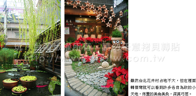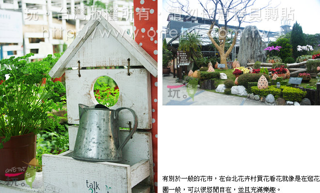 走在氣氛悠閒自在的台北花卉村裡,一點也不像逛普通花市,最大的特色就是這裡隨處可見的創意景觀,充滿趣味的陶藝作品,並且隨著賞花花季月分的不同,門口與園內各處都能看到主題性的花卉佈置,這裡就像個繽紛且多采多姿的都市花園。