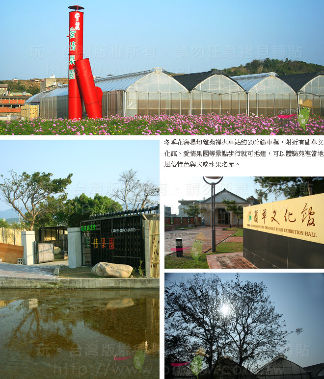 台鐵至苑裡火車站or台北搭巨業客運至苗栗苑裡客運站→車站出來斜右方對面馬路搭苗栗客運→搭往泰田方向班車,山腳社區or藺草文化館下車→苗140線上油菜花海遍佈,步行即可欣賞
